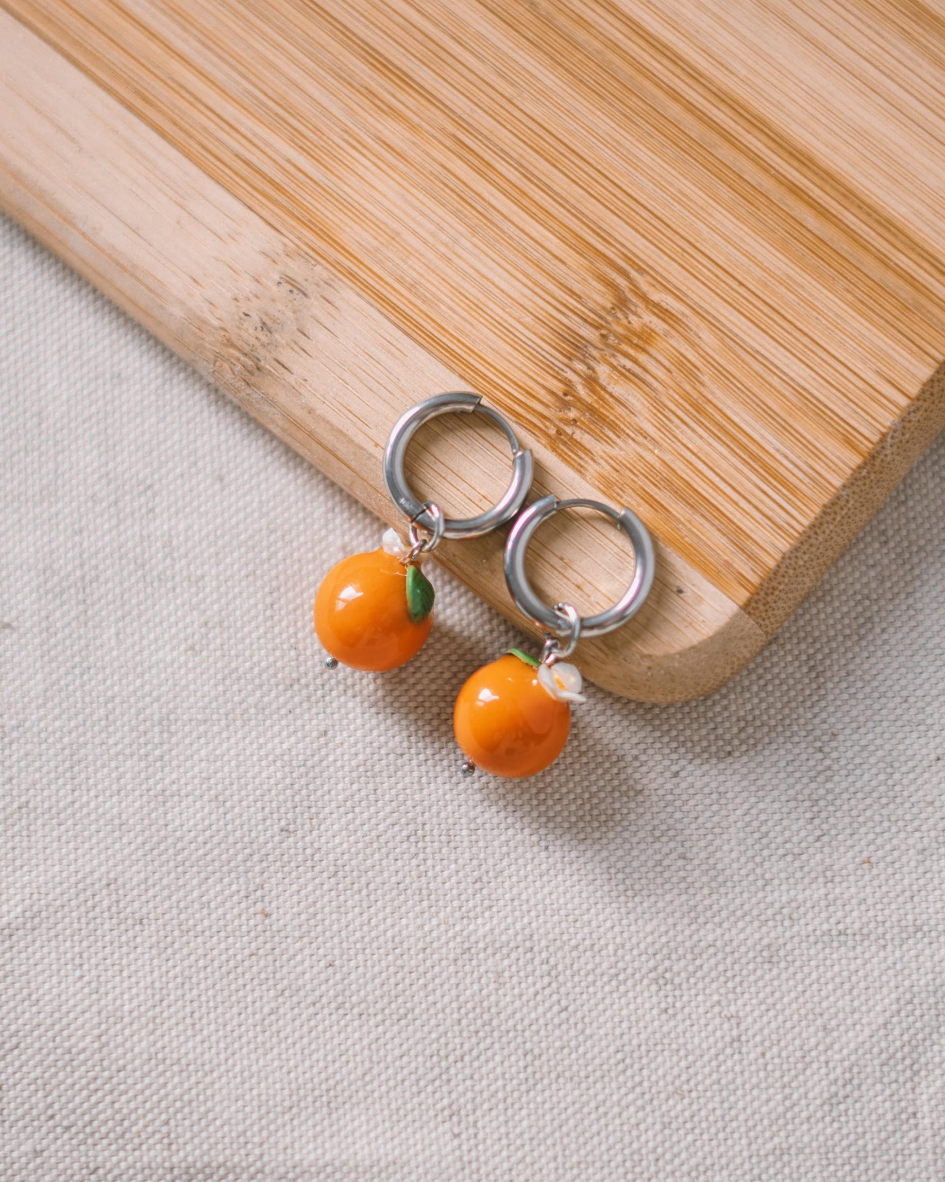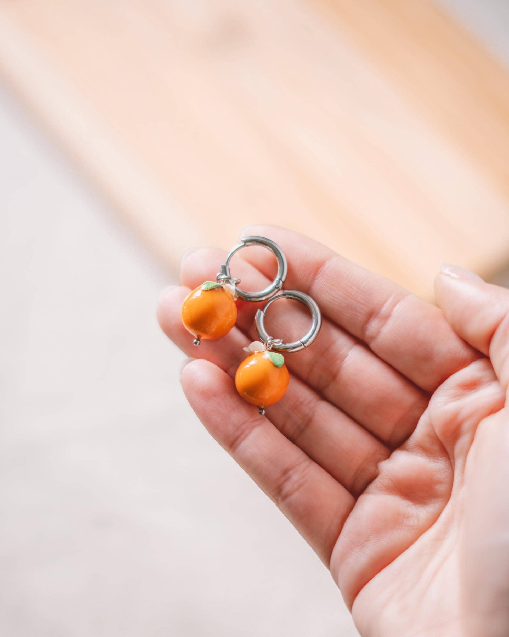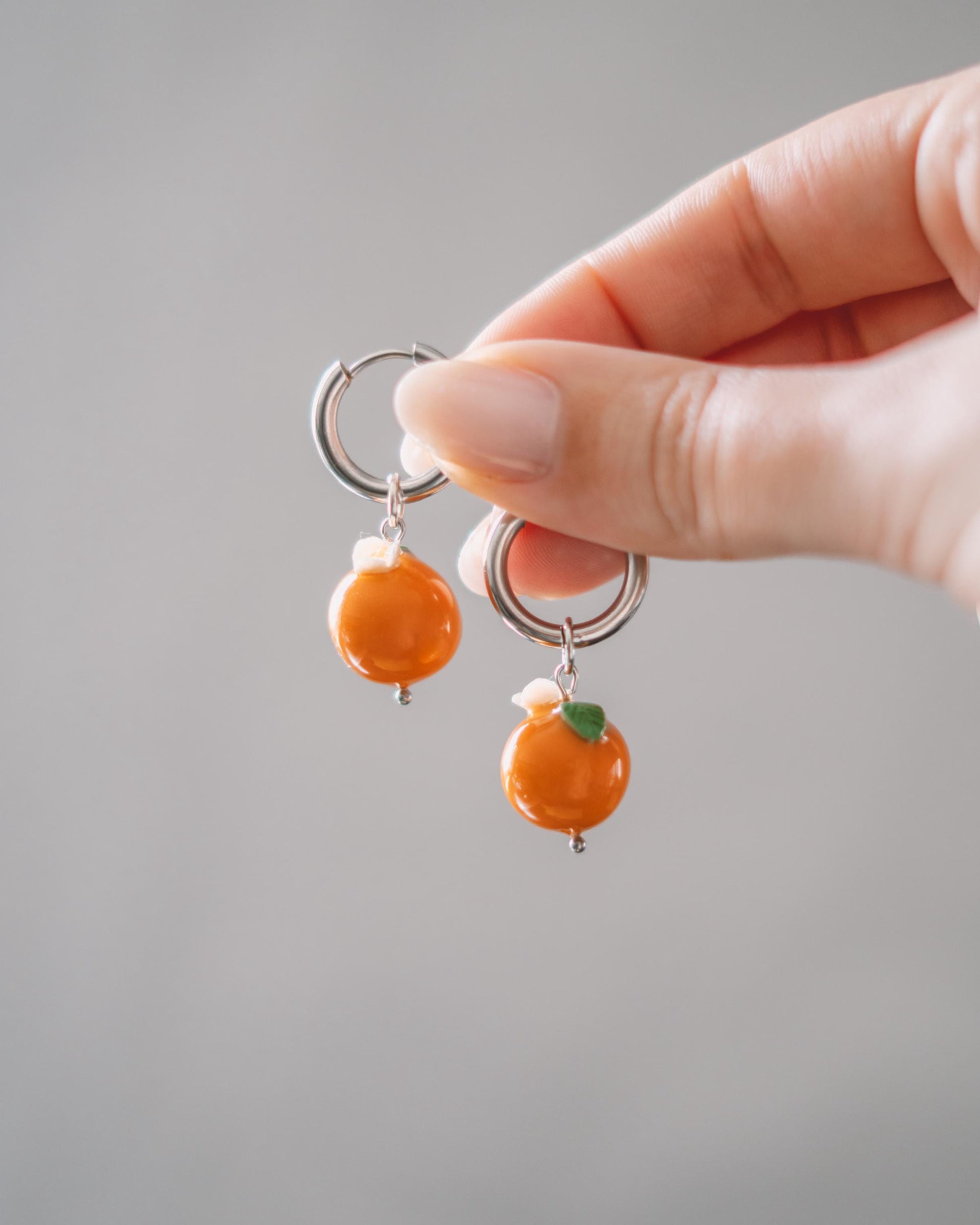 Brincos de argola com laranjas em miniatura, feitos à mão em argila.